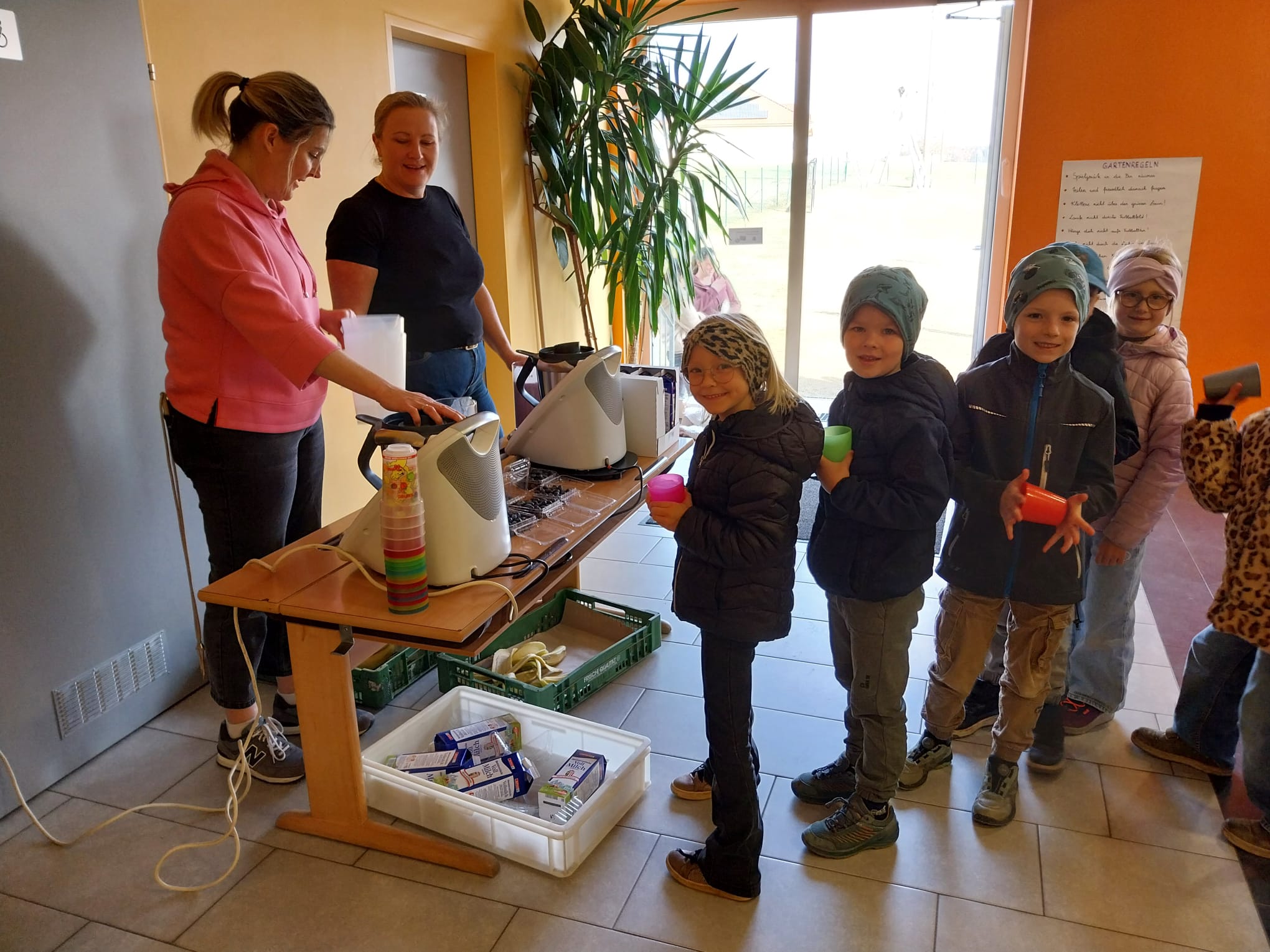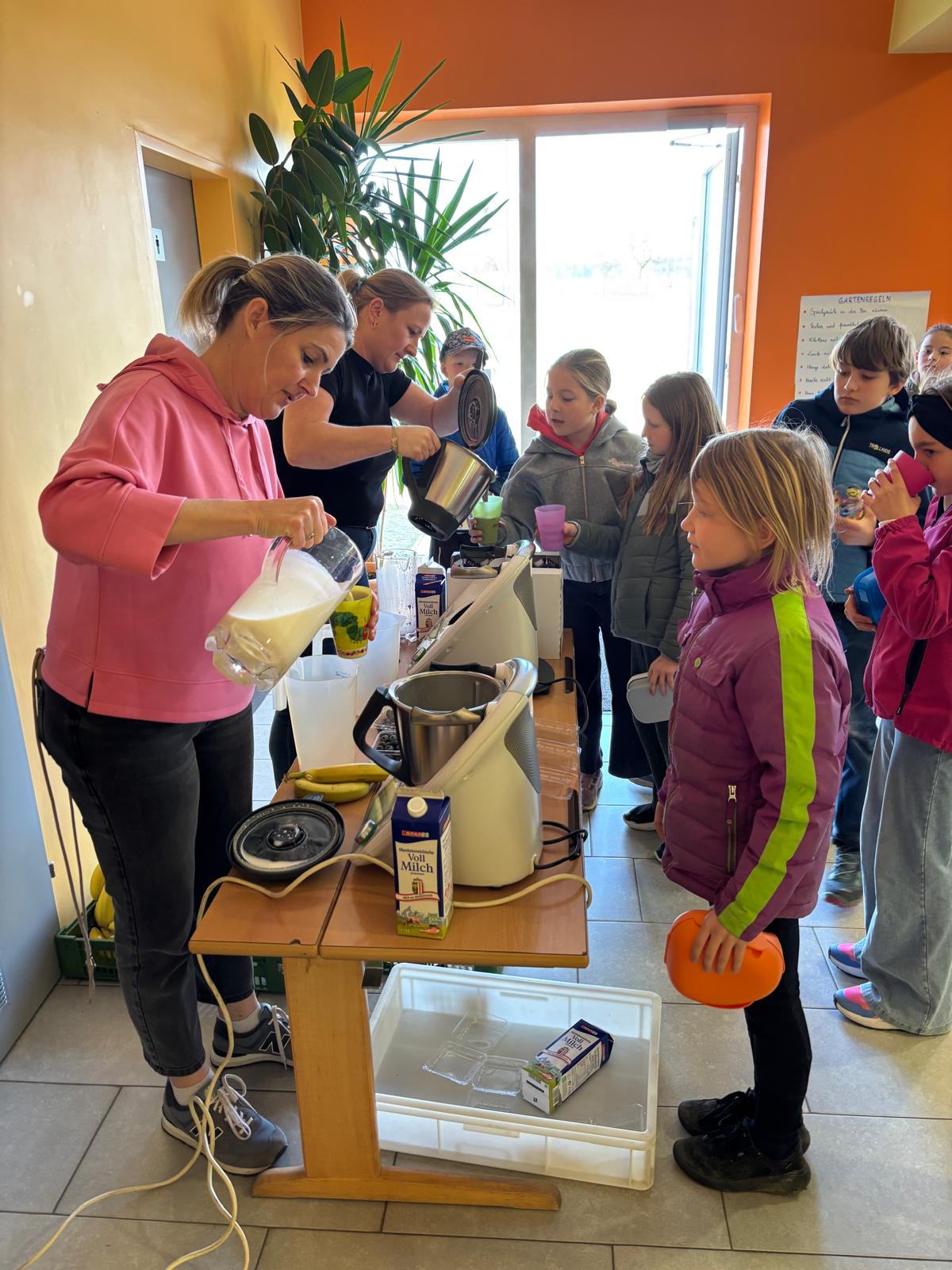 Ein besonderes Erlebnis war die letzte Gesunde Jause – mit dem Thermomix wurden Heidelbeer- und Erdbeer-Bananenmilch für alle unsere Kinder gemixt!