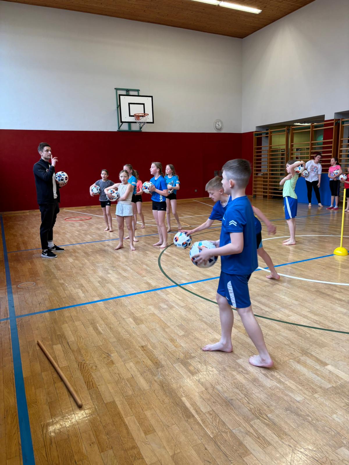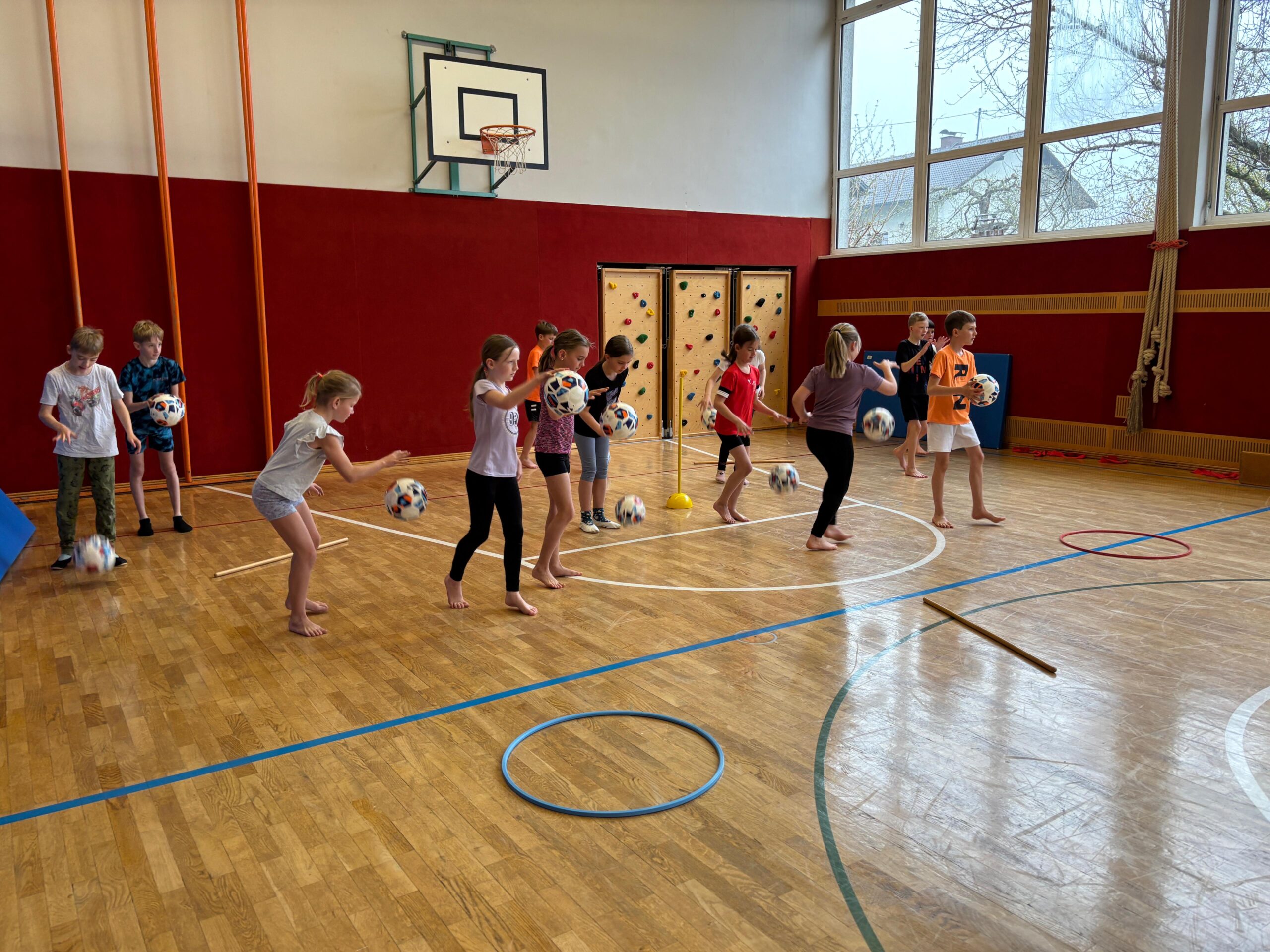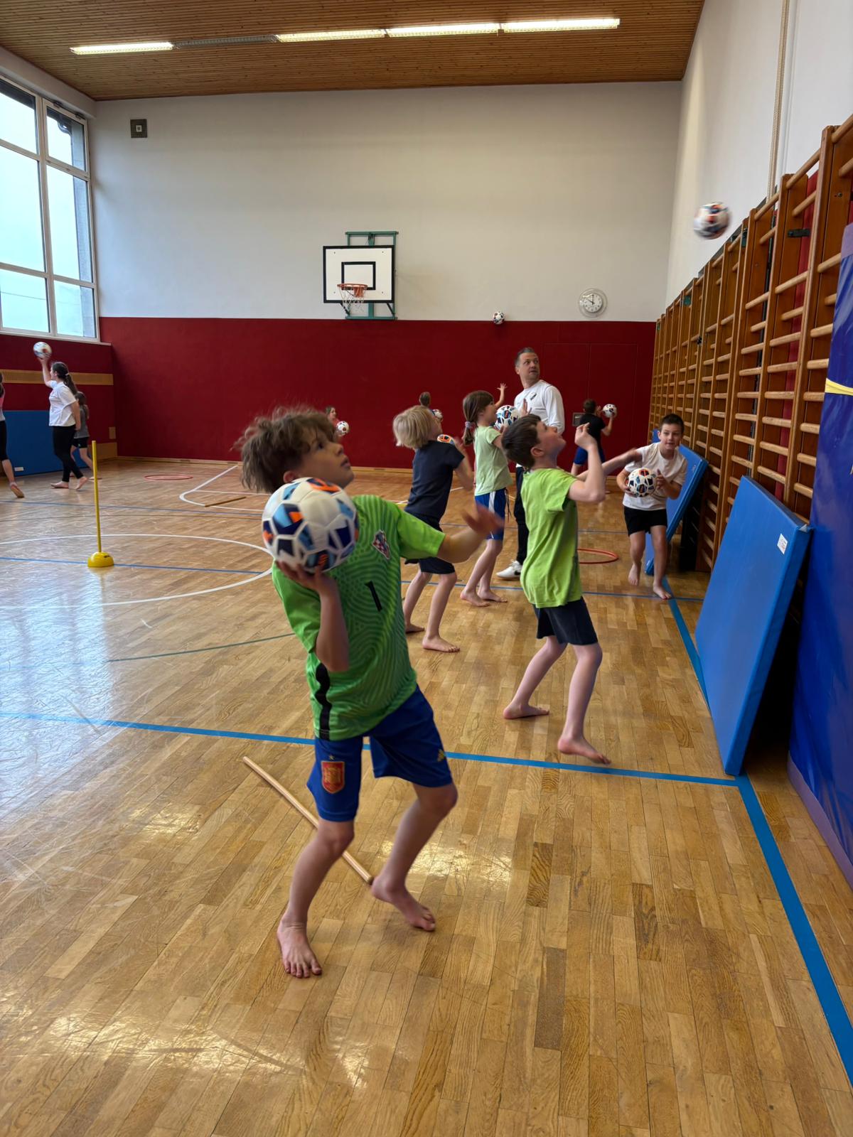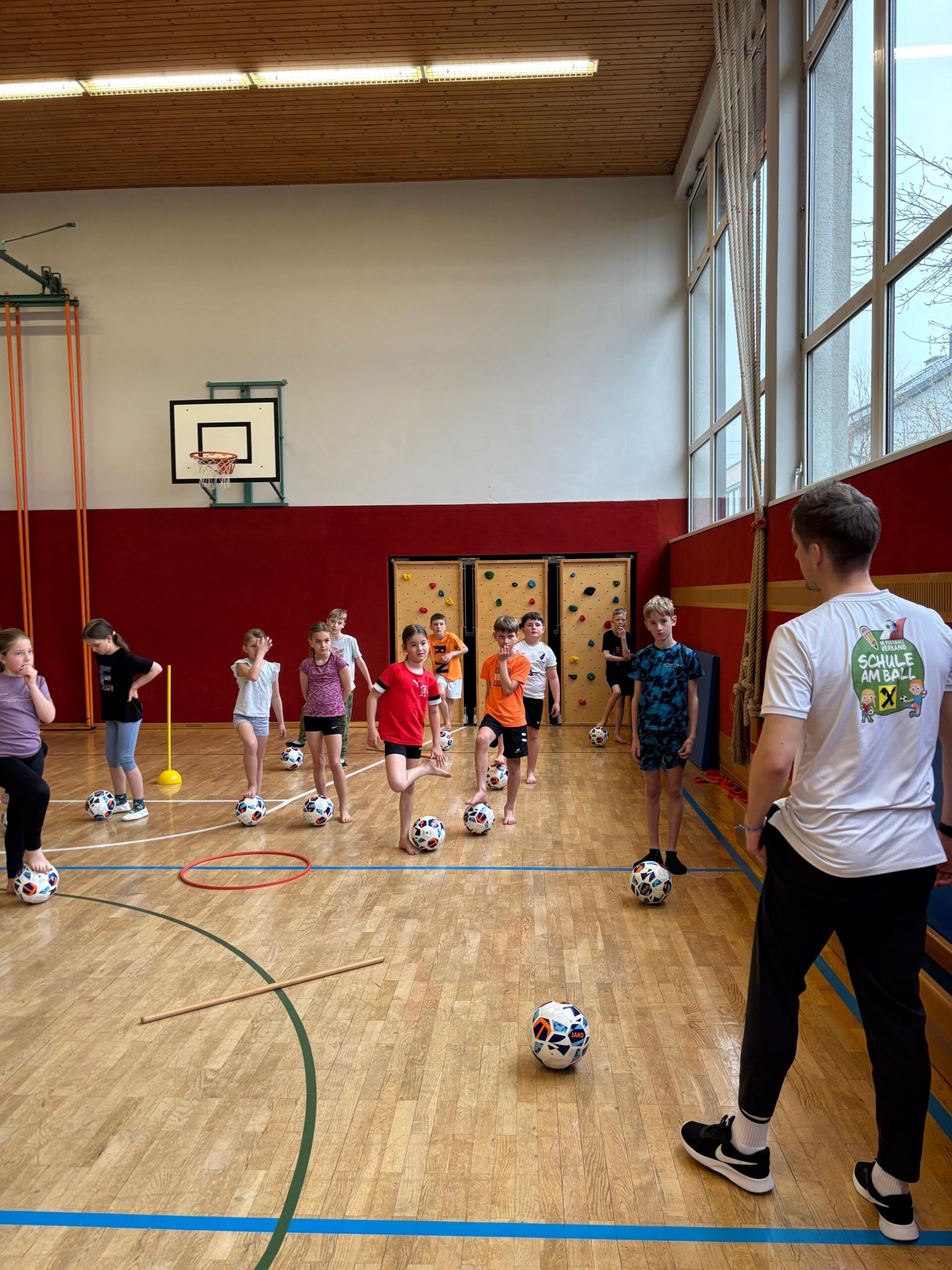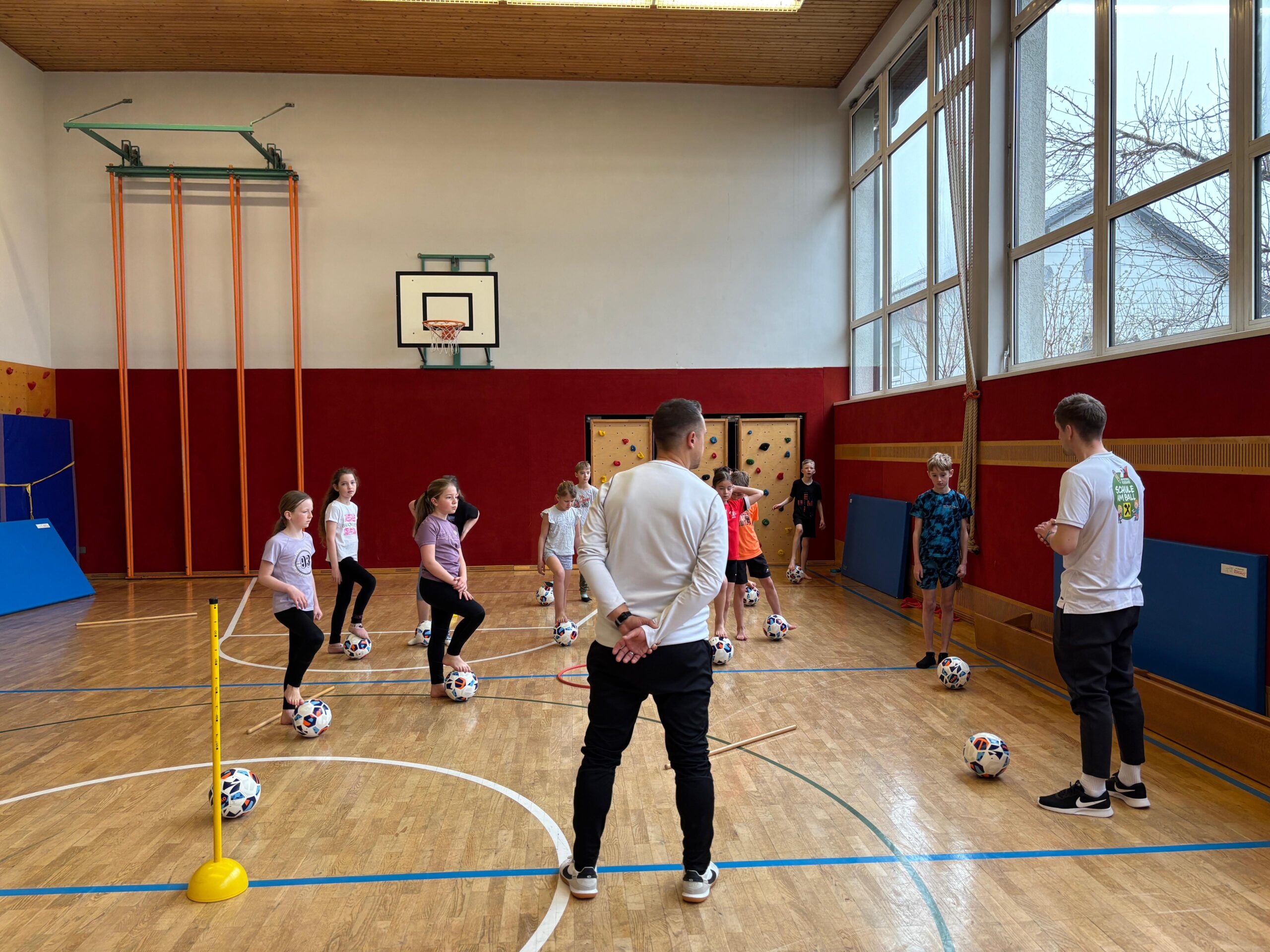 Am letzten Freitag ging es in der dritten und vierten Klasse besonders sportlich zu: Mit Günther Lang und Ali Katzmaier kam das Projekt „Schule am Ball“ zu uns an die Schule. In einer abwechslungsreichen Turnstunde zeigten die beiden den Kindern spielerisch wichtige Techniken rund um das Fußballspielen. Zum Abschluss durfte natürlich ein kurzes Match nicht fehlen, bei dem die Kinder ihr Können gleich ausprobieren konnten. Die Begeisterung war groß: Eine Stunde lang wurden alle ordentlich ausgepowert und erhielten wertvolle Impulse zu Bewegung, Teamgeist und Zielsetzung.
