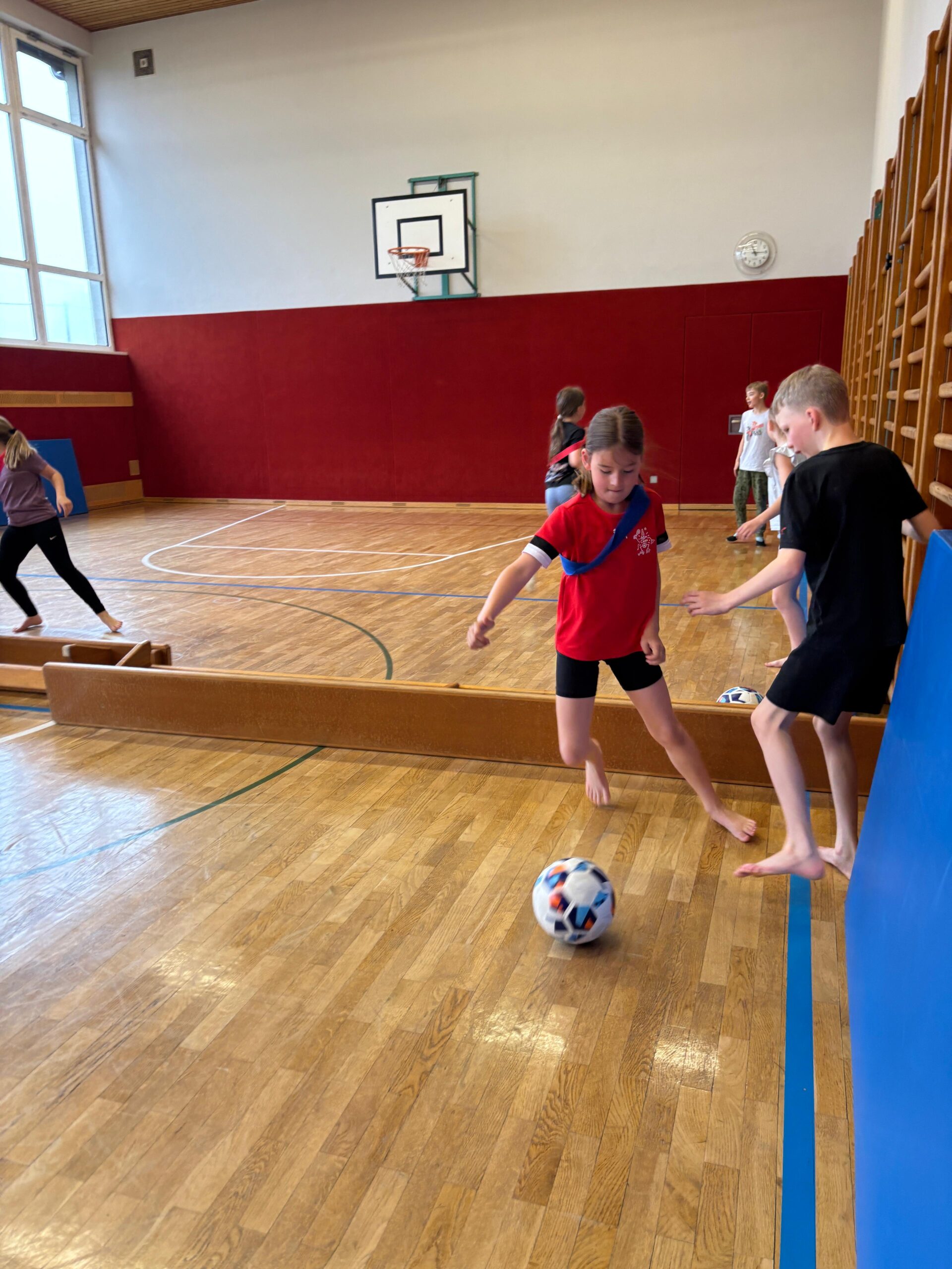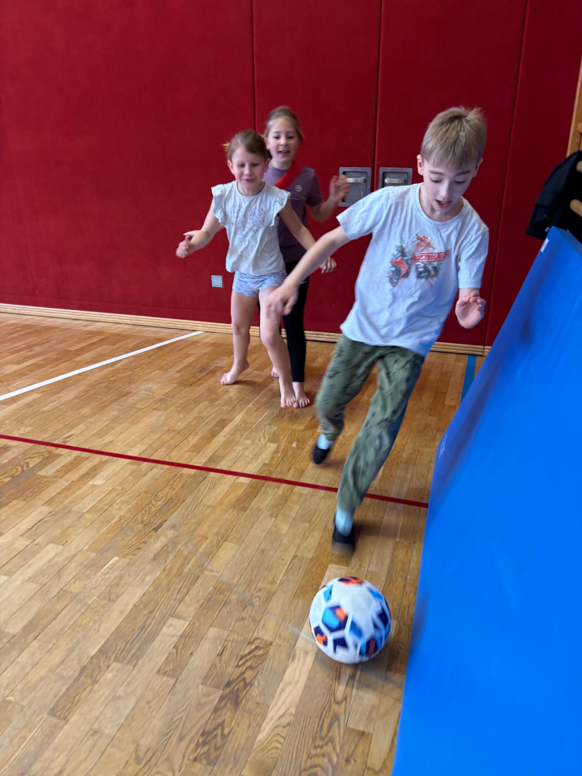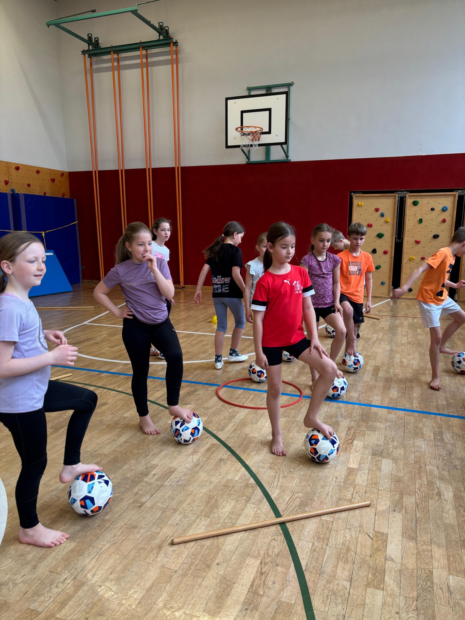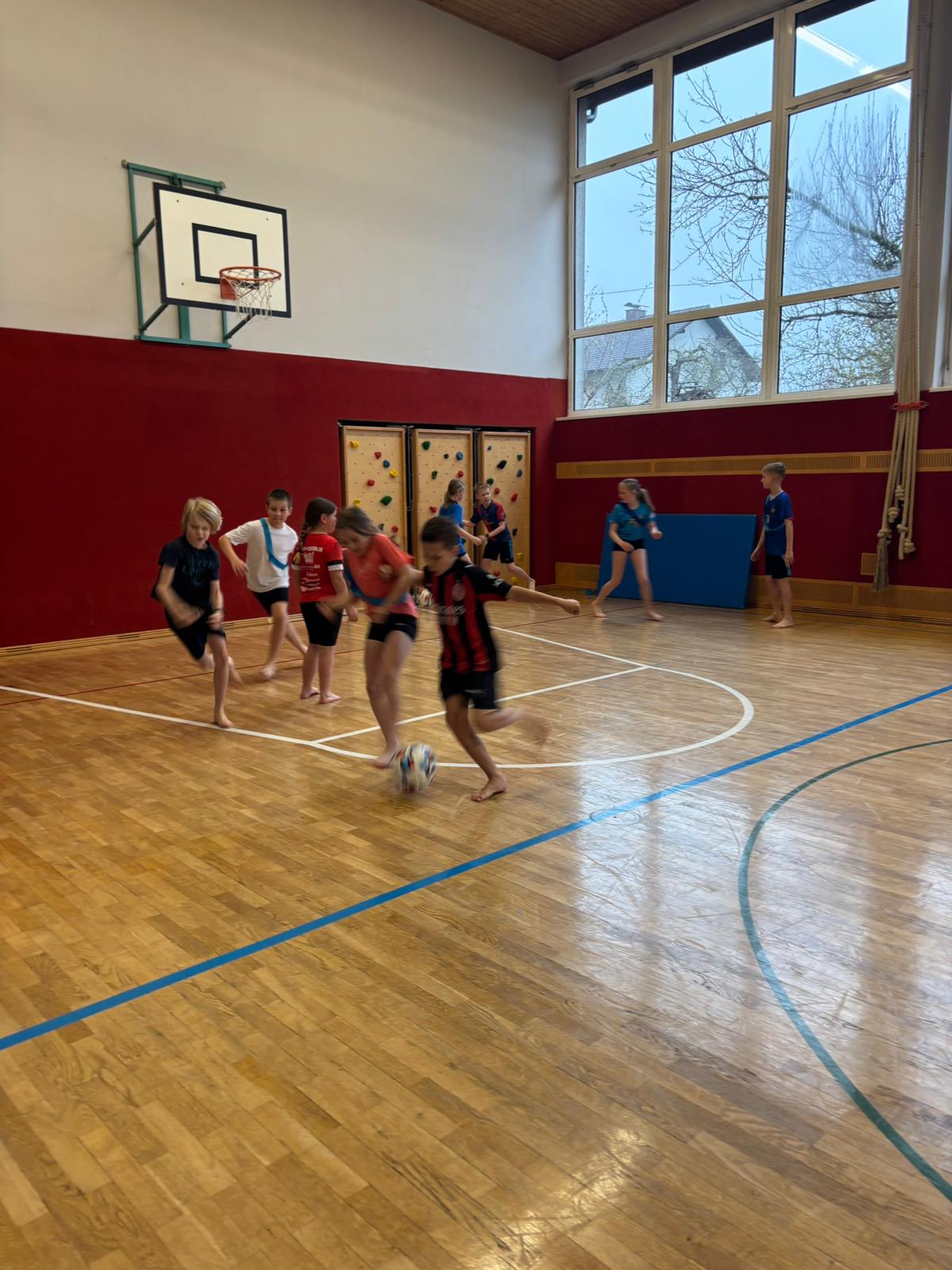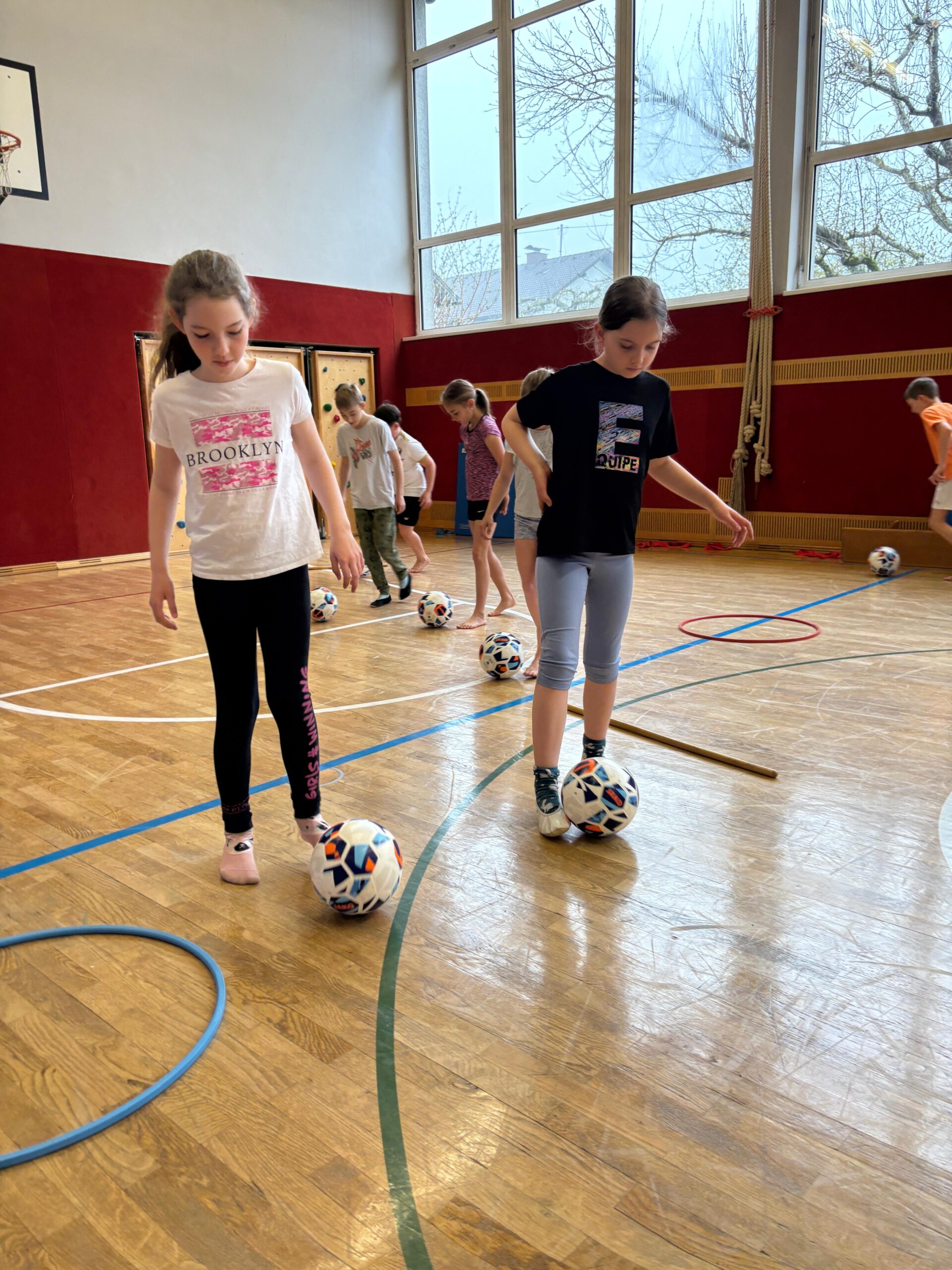 Am letzten Freitag ging es in der dritten und vierten Klasse besonders sportlich zu: Mit Günther Lang und Ali Katzmaier kam das Projekt „Schule am Ball“ zu uns an die Schule. In einer abwechslungsreichen Turnstunde zeigten die beiden den Kindern spielerisch wichtige Techniken rund um das Fußballspielen. Zum Abschluss durfte natürlich ein kurzes Match nicht fehlen, bei dem die Kinder ihr Können gleich ausprobieren konnten. Die Begeisterung war groß: Eine Stunde lang wurden alle ordentlich ausgepowert und erhielten wertvolle Impulse zu Bewegung, Teamgeist und Zielsetzung.