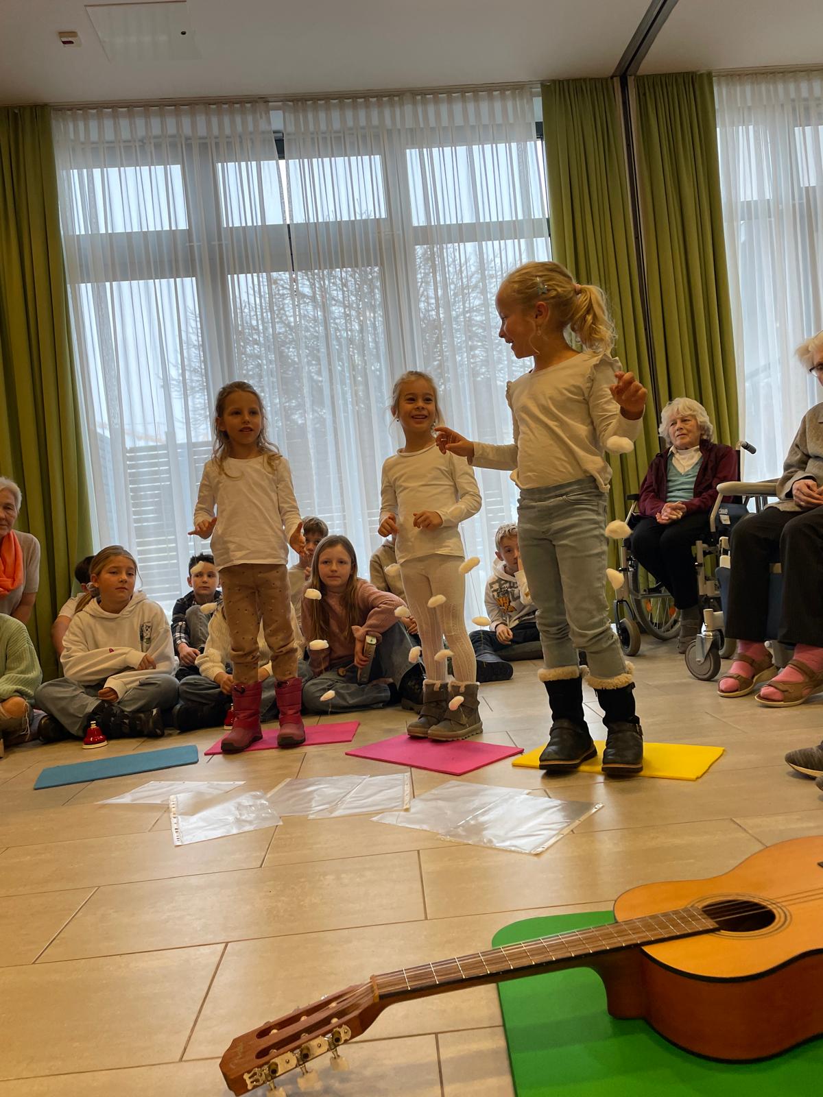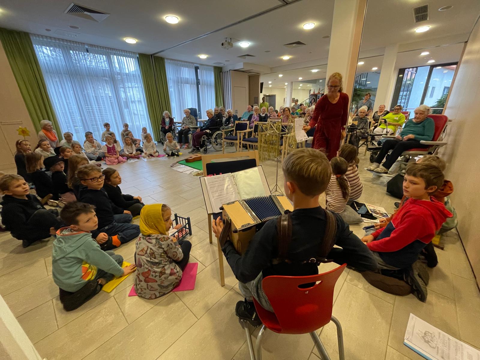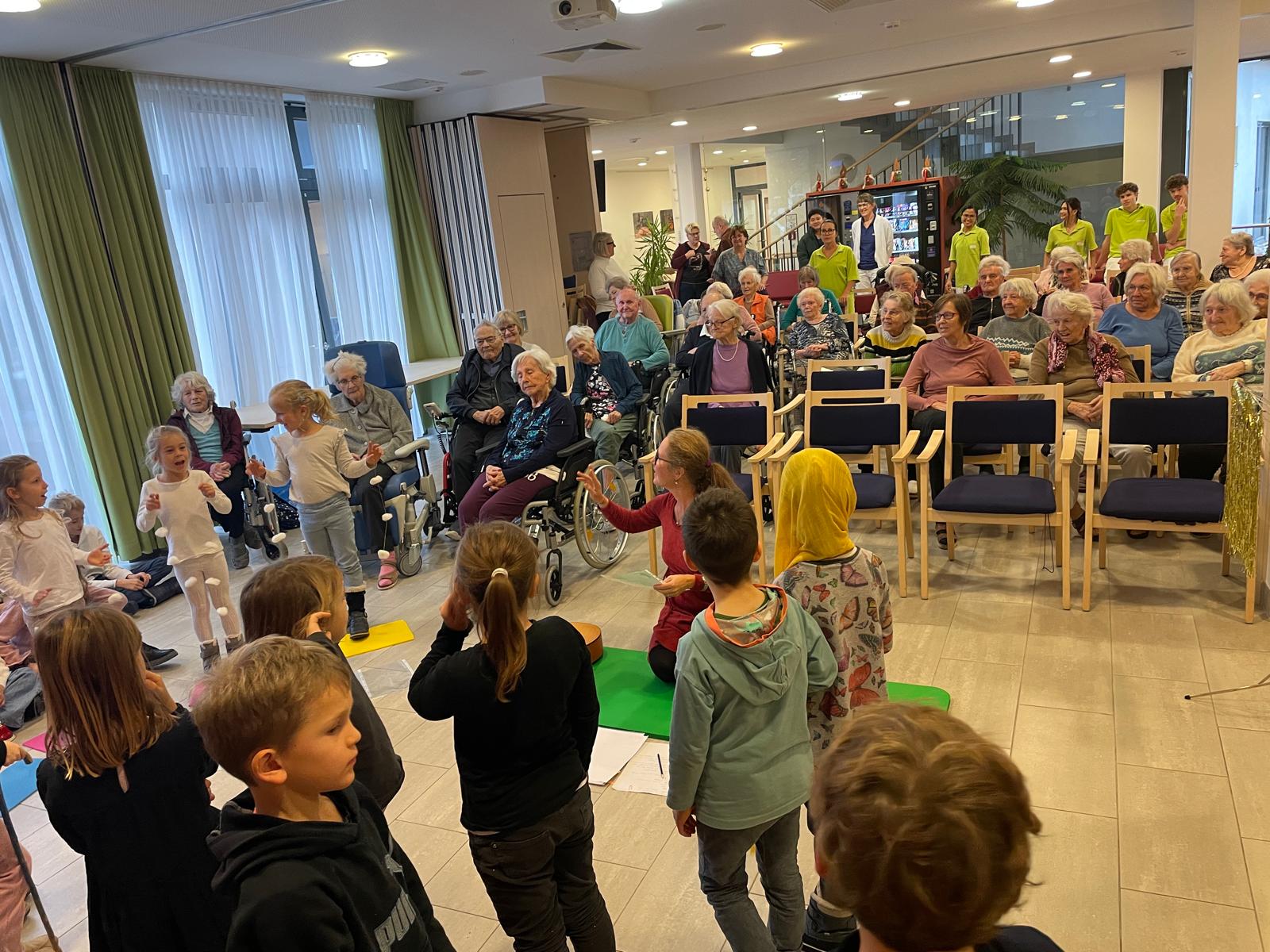 Projekt „Wenn ich einmal so alt bin…“ Frau Mayr organisierte einen Besuch im Altenheim Walding mit der 1. Klasse. Mit dabei waren auch Musikanten aus den anderen Klassen.