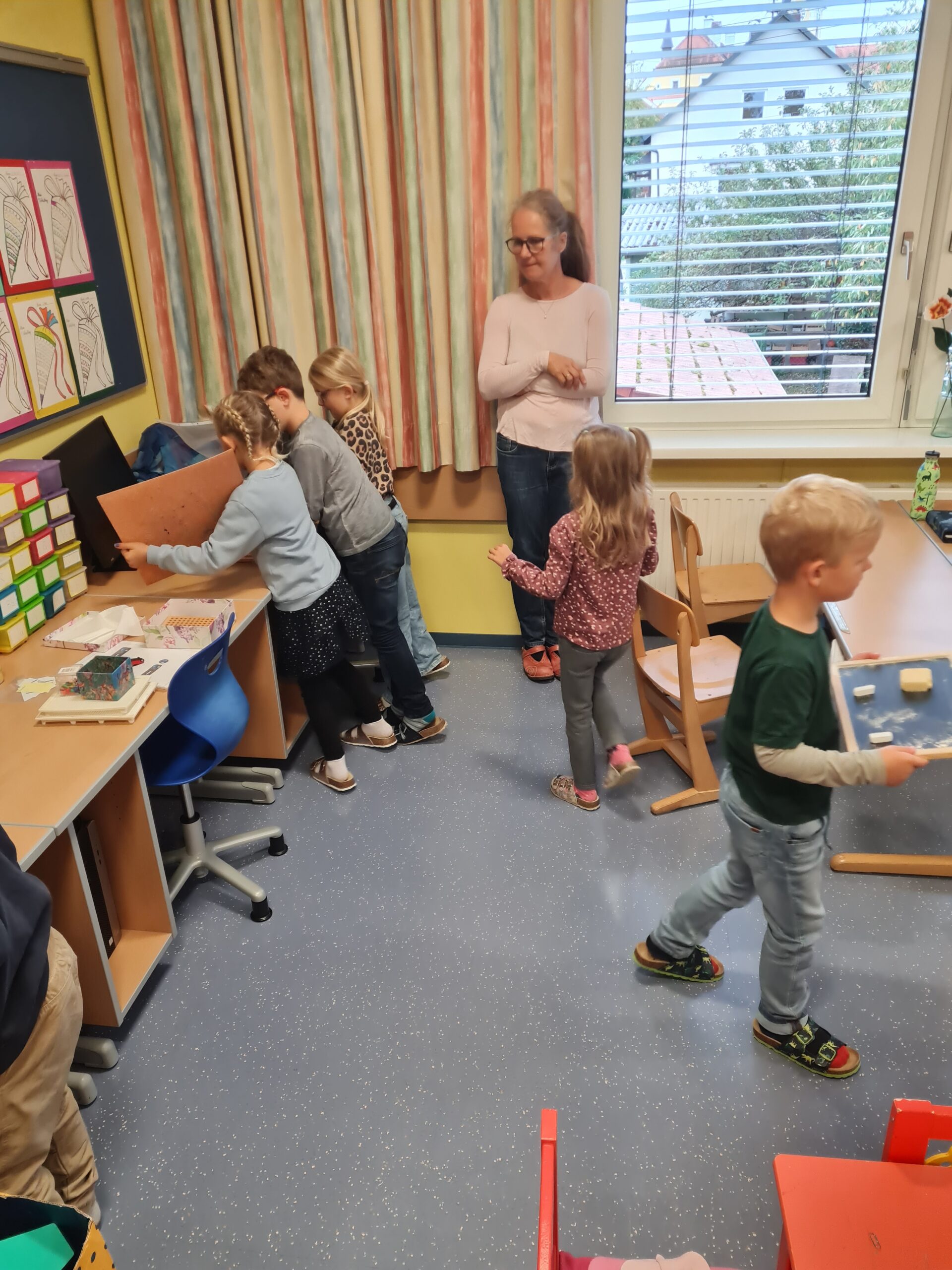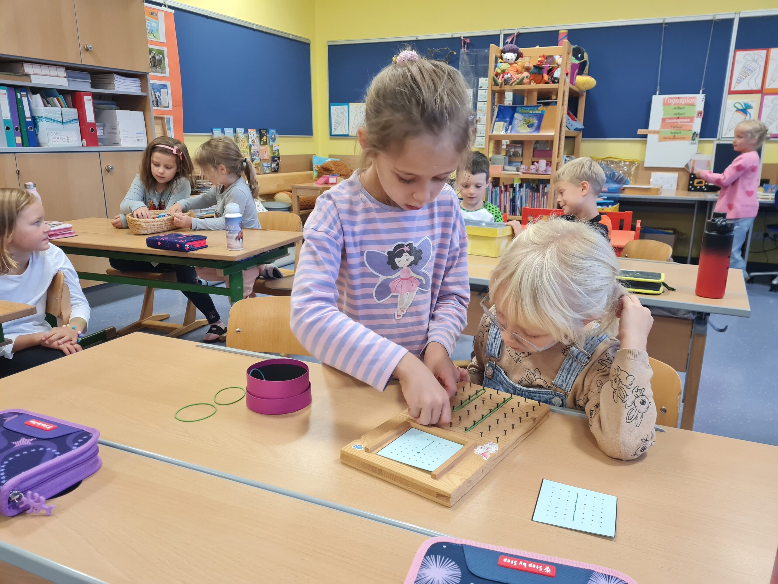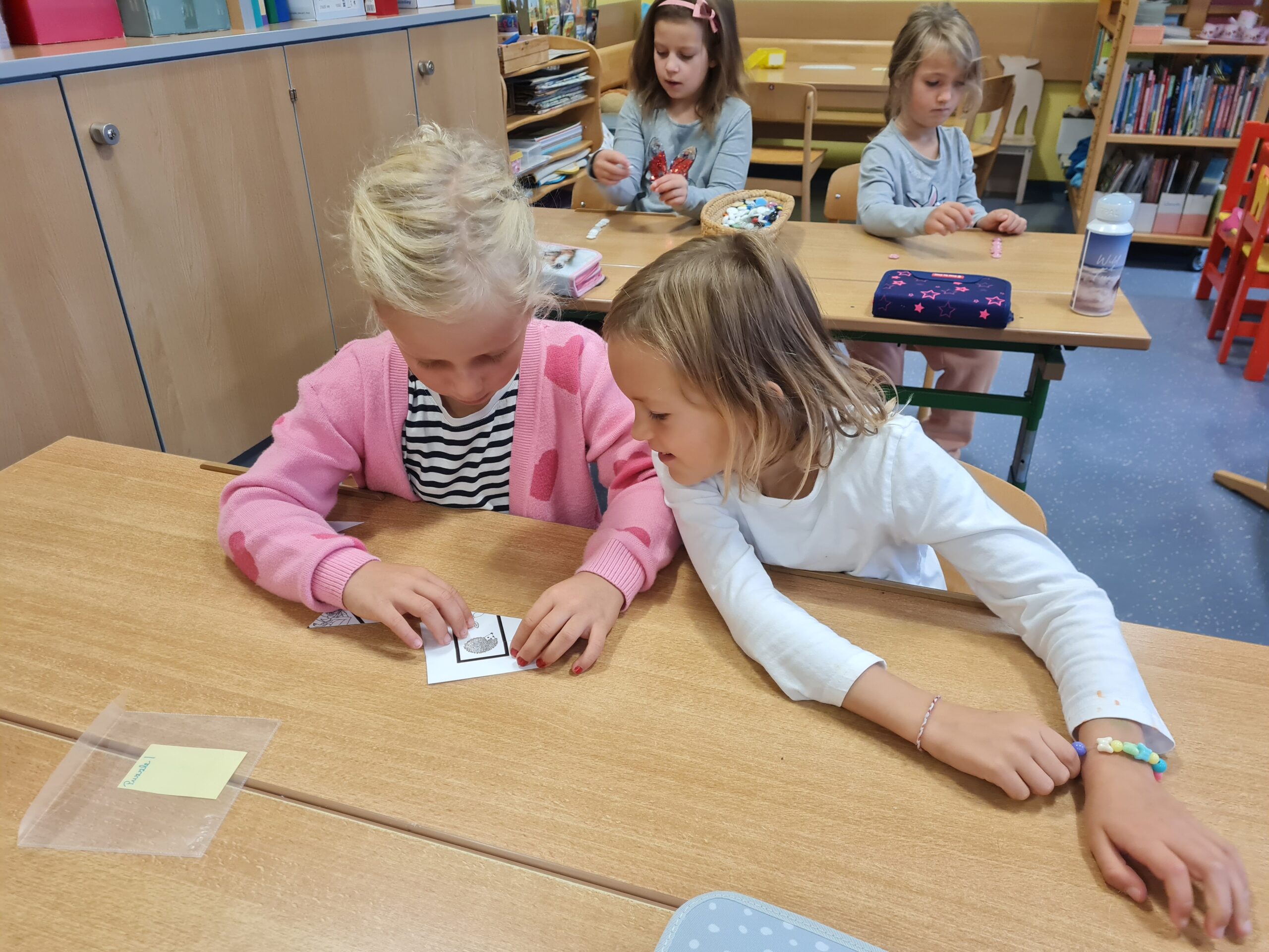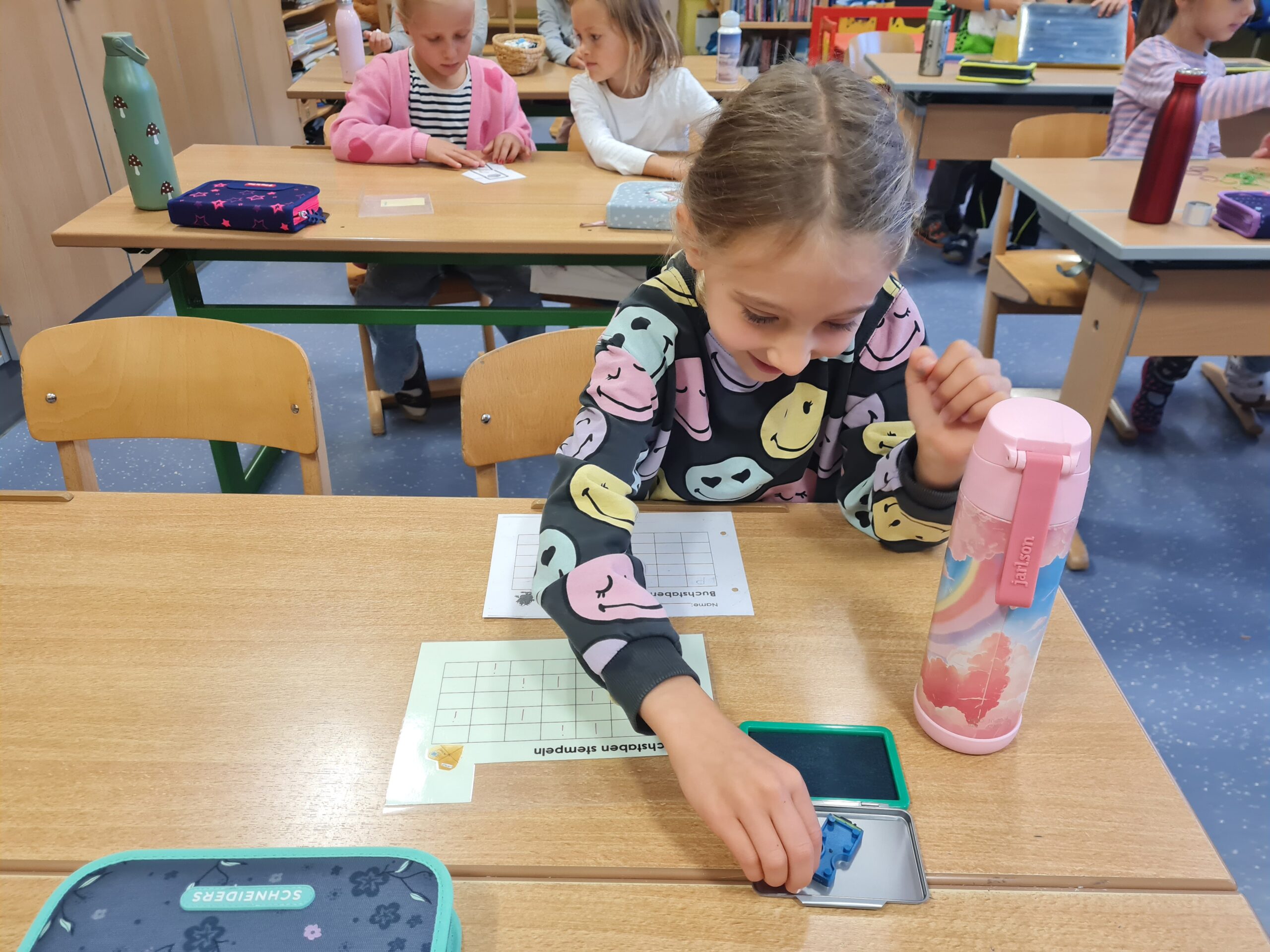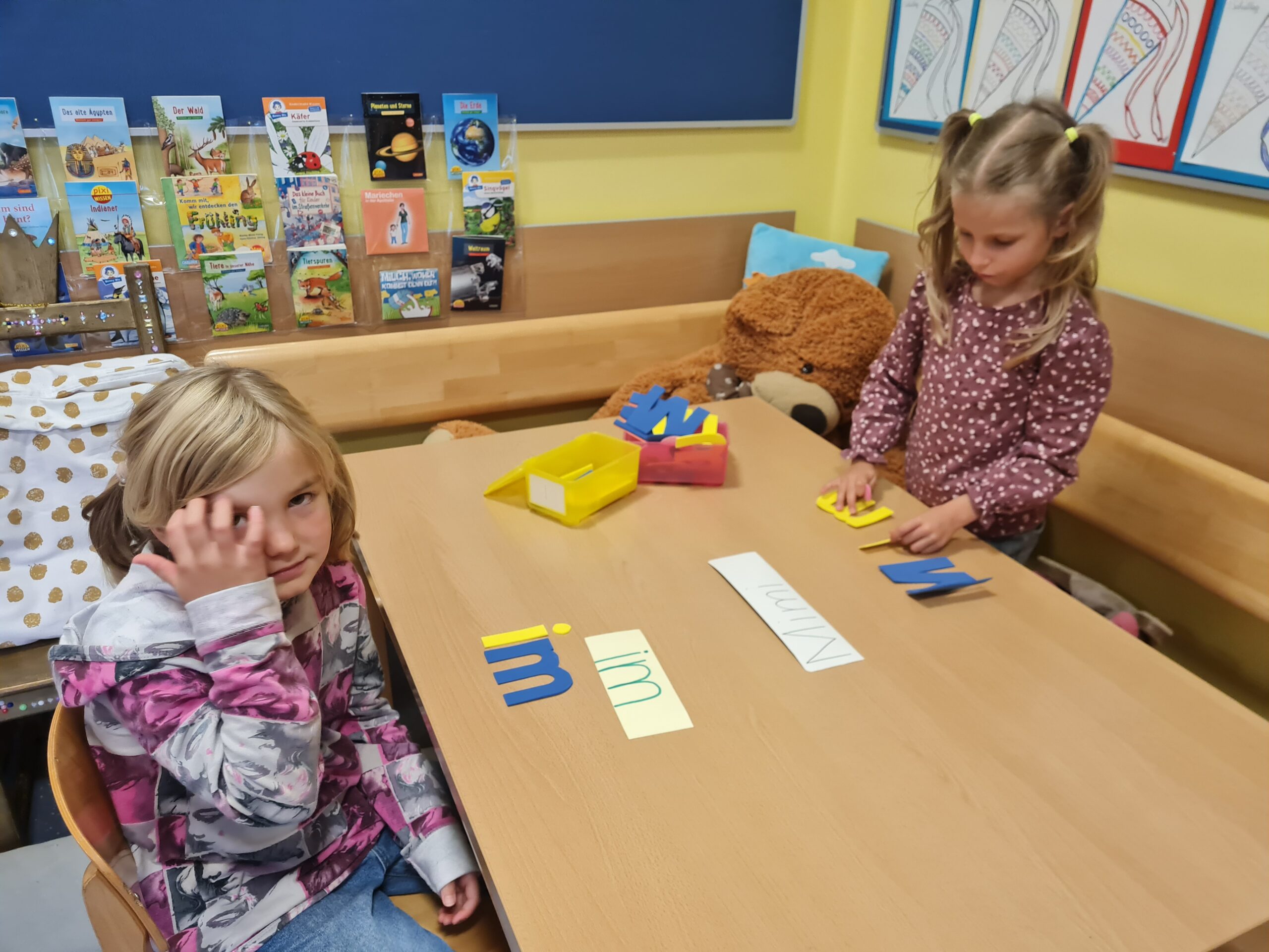 Stationen in der 1. Klasse Fleißig gearbeitet wird an verschiedenen Stationen zu den bereits erlernten Buchstaben. Auch im Förderunterricht wird kreativ gelernt.